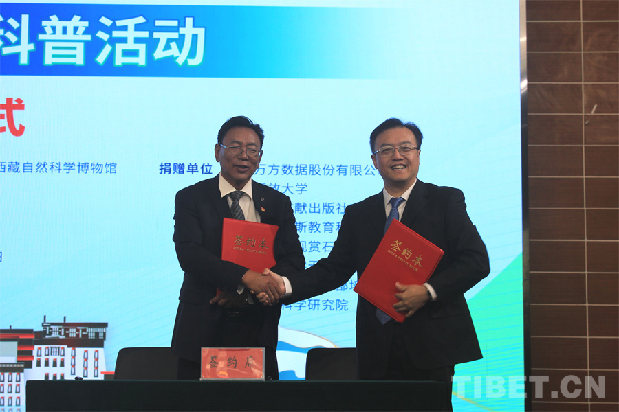 啟動儀式后,來自北京、江蘇、上海及西藏當地的8家企業(yè)和機構為計劃提供科普資源捐助。8家資源捐贈方代表與受贈方西藏自然科學博物館分別簽訂捐贈協議。