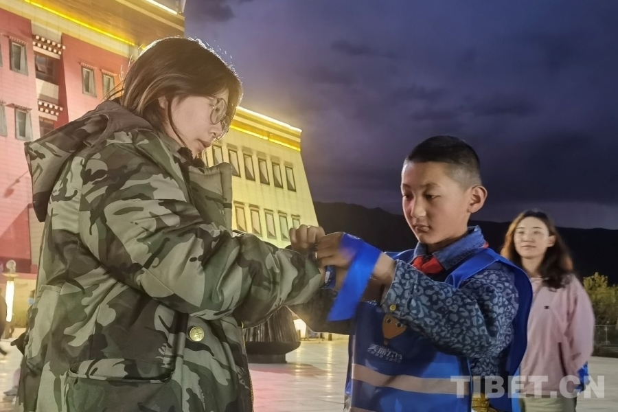 夜幕降臨,研學(xué)游團(tuán)隊(duì)來到文成公主劇場。穿上藍(lán)馬甲,孩子們搖身一變成了文明旅游的小小宣傳員。帕里鎮(zhèn)小學(xué)注重培養(yǎng)學(xué)生的生態(tài)文明意識,自2023年7月起,主動加入“美麗公約”志愿組織的“擦亮天路行動”。學(xué)生定期在帕里鎮(zhèn)清理垃圾,也會為沿國道562來到帕里的游客宣傳垃圾隨身走的文明旅游理念。今天,來到拉薩,孩子們再次熟練地向劇場周圍的觀眾宣傳起來,一邊為大家在右臂系上代表文明旅游承諾的藍(lán)絲帶,一邊鼓勵(lì)“一起守護(hù)第三極,因?yàn)橛心?,中國更美”?/span>一時(shí)間,文成公主劇場周圍成為了藍(lán)絲帶的海洋。