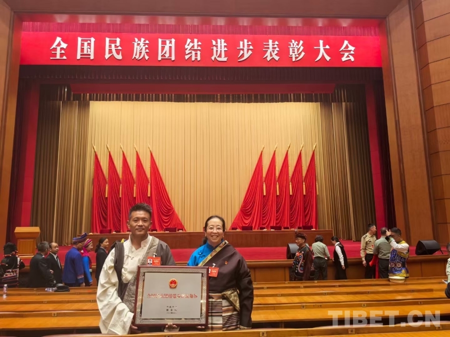 圖為全國民族團(tuán)結(jié)進(jìn)步模范集體代表頓珠才嘎與全國民族團(tuán)結(jié)進(jìn)步模范個人獲得者次仁拉姆