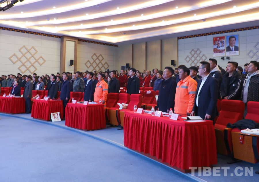 圖為開(kāi)幕式上,全體參會(huì)人員起立齊唱國(guó)歌