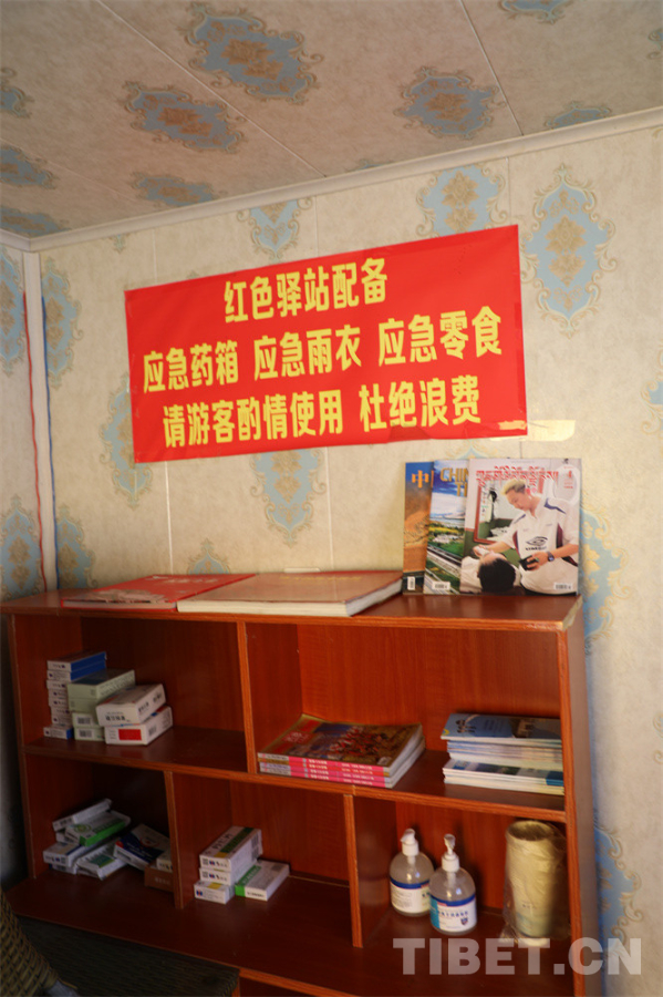 圖為佩枯錯旁邊的石榴籽紅色驛站內免費配備的藥物、洗手液、紙杯、雜志等物品,記者也將《中國西藏》雜志擺放在內,希望給游客的旅程帶去一些收獲 攝影:王茜