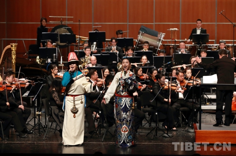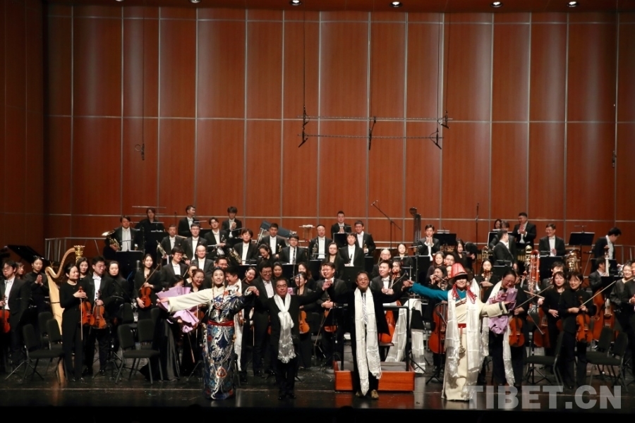 音樂會上,兩位藏族歌手演唱了交響樂主題曲《金橋》,歌曲高亢嘹亮、曲調(diào)悠揚。藏戲、山歌等元素的加入,讓交響樂更加豐富,充滿了濃郁的民族風(fēng)情。