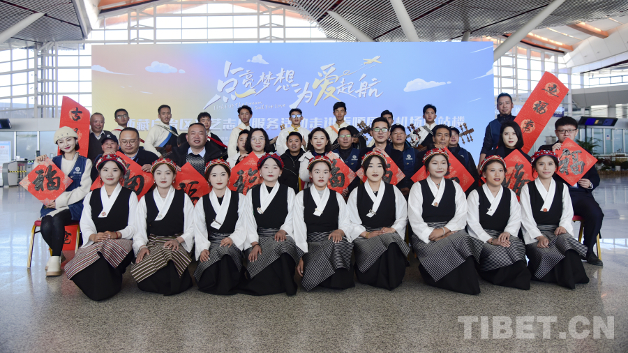 活動現(xiàn)場,29名西藏文藝志愿者走進(jìn)拉薩貢嘎國際機(jī)場航站樓,開展送“?!弊?、送“扎西德勒”、送春聯(lián)、扎木念彈唱等活動,為過往旅客和工作人員帶來了一場別開生面的文化體驗。