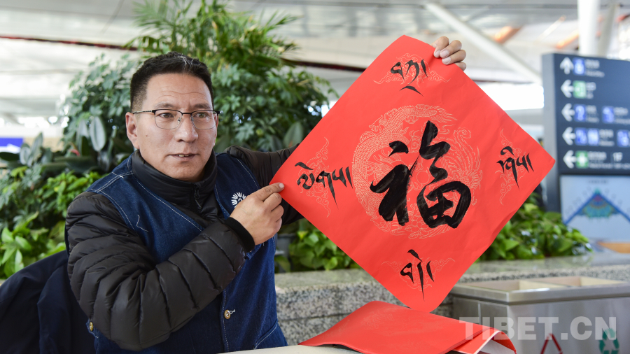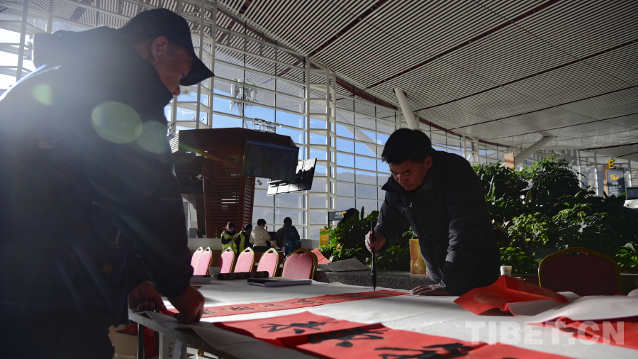 拉薩貢嘎國際機(jī)場內(nèi),映入眼簾的是航站樓二樓大廳里“點亮夢想 為愛起航”——西藏自治區(qū)文藝志愿服務(wù)活動走進(jìn)貢嘎國際機(jī)場航站樓巨型廣告牌,藍(lán)天白云、雪山航線的畫面充滿了文藝范兒,格外醒目,吸引了不少旅客的目光。大廳西側(cè)的志愿者們現(xiàn)場揮毫潑墨,為旅客書寫寓意吉祥的“福”字和寓意祝福的“扎西德勒”,并將這些蘊含著美好祝愿的書法作品免費贈送給旅客,為他們的旅途增添了更多的溫暖和祝福。