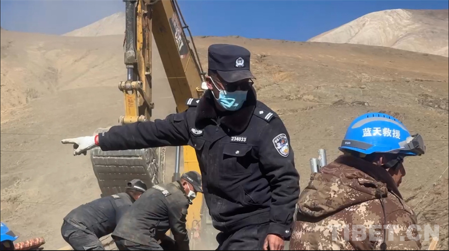 圖為拉孜縣公安民警在曲下鎮(zhèn)吉如村進(jìn)行救援工作 攝影:格桑羅布