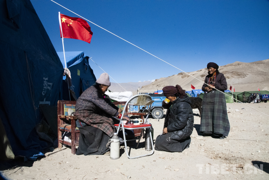 圖為楚卡村安置點(diǎn)村民正在帳篷外喝酥油茶 攝影:趙振宇