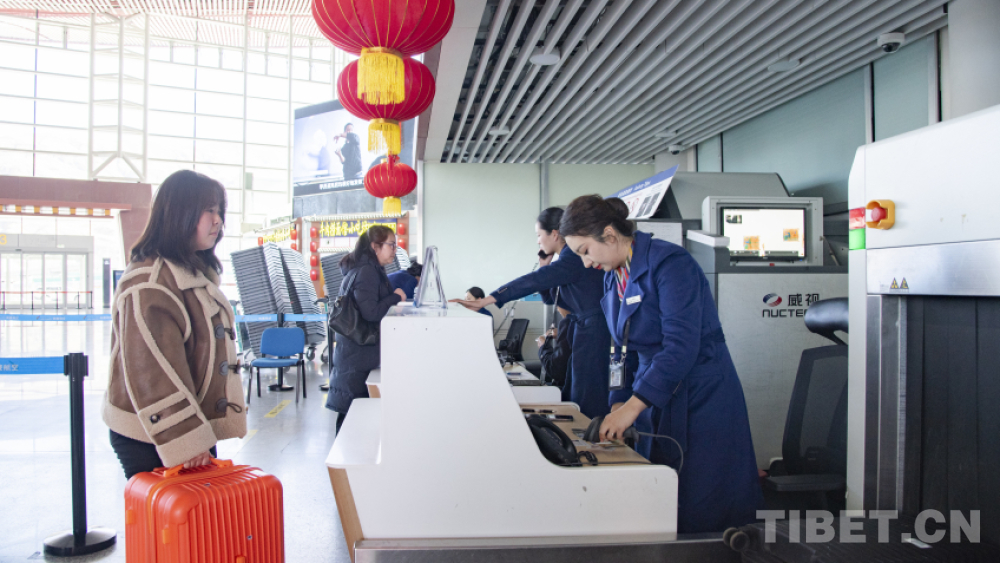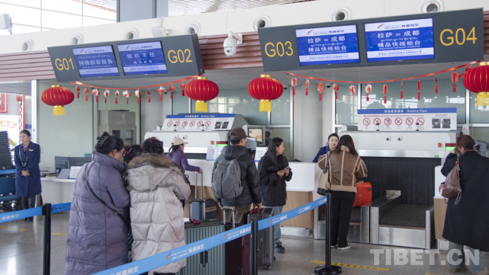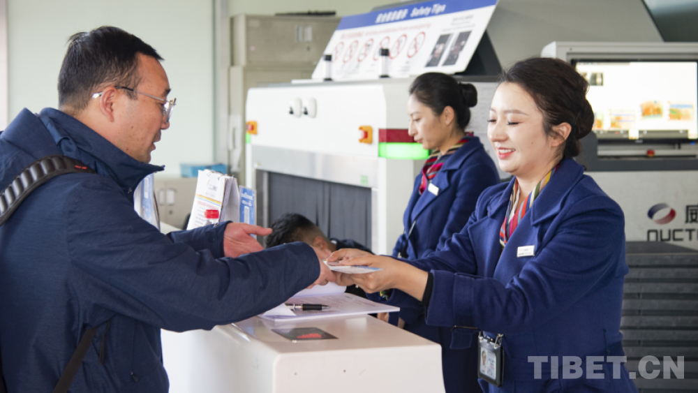 “您好,先生,請問您乘坐藏航哪趟航班?請出示您的身份證。您有托運(yùn)行李嗎?托運(yùn)行李中有鋰電池、充電寶嗎?這些是不能托運(yùn)的,只能隨身攜帶。請拿好您的登機(jī)牌。再見,祝您歸途愉快!”1月25日,記者在拉薩貢嘎國際機(jī)場T3航站樓G島柜臺,見到了西藏航空公司拉薩基地值機(jī)服務(wù)隊(duì)隊(duì)長次仁卓嘎。