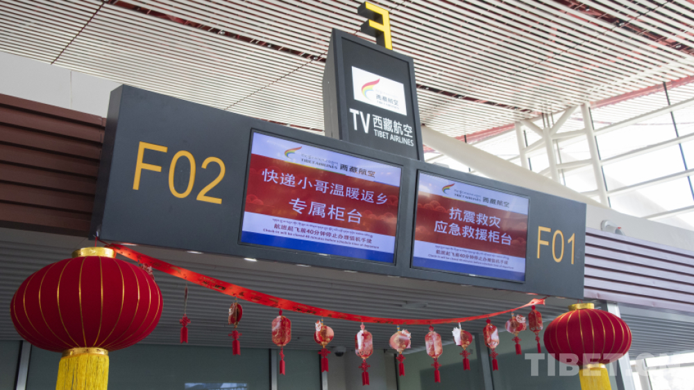 圖為西藏航空開設(shè)的快遞小哥溫暖返鄉(xiāng)專屬柜臺和抗震救災(zāi)應(yīng)急救援柜臺 攝影:趙振宇