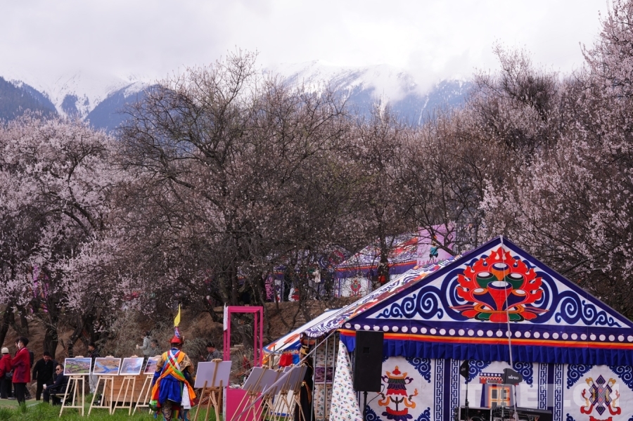 圖為遠(yuǎn)處的雪山、桃樹、藏式帳篷構(gòu)成的一幅美麗畫卷 攝影:德吉卓瑪