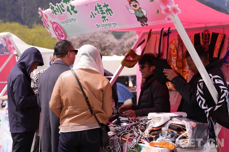 沿著蜿蜒的小路,一邊是錯落有致的桃花樹,一邊是特色集市。“這些是工布男女服飾、這是馬套、這是藏式包包……都是我們合作社的工作人員手工制作的。”在舞臺一旁的桃花小集市,林芝市巴宜區(qū)絲綢藏裝定制農(nóng)牧民專業(yè)合作社負(fù)責(zé)人尼瑪扎西正向游客一一介紹自家展銷點(diǎn)的產(chǎn)品以及其背后的文化和制作過程。經(jīng)過一番討價(jià)還價(jià),一千余元的“大單子”順利成交,游客將一件件精美的巴宜“小禮品”裝進(jìn)袋子和尼瑪扎西揮手告別。