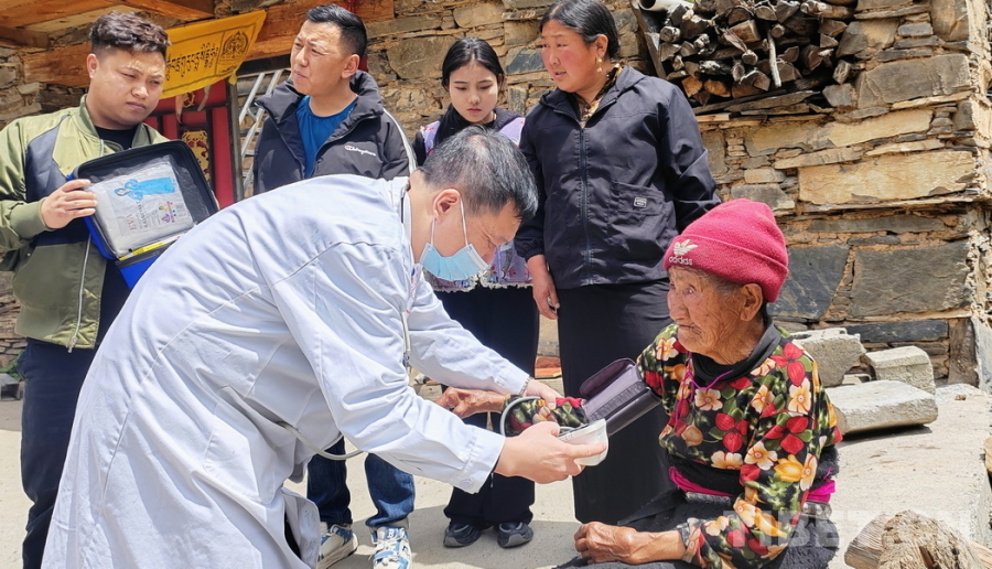 圖為 “同心·共鑄中國心”2025阿壩行大型健康公益綜合服務活動義診醫(yī)療專家在四川省阿壩州馬爾康市日部鄉(xiāng)入戶巡診,為行動不便的老人送醫(yī)送藥 攝影:張宏武