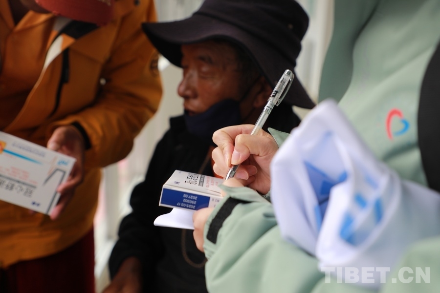 圖為喜雷(前左一)和尹超邦(前左二)在義診現(xiàn)場(chǎng)分診 攝影:楊月云