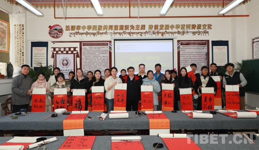 走進(jìn)西藏民族大學(xué)社科樓里內(nèi)的“鑄牢中華民族共同體意識(shí)書法實(shí)踐基地”,基地負(fù)責(zé)人扎西曲杰正帶領(lǐng)他的小伙伴書寫書法作品。指著一幅幅書法作品,扎西曲杰自豪地說,我們基地的各族學(xué)生用“寫”在一起的形式傳承中華優(yōu)秀傳統(tǒng)文化,推廣國(guó)家通用語(yǔ)言文字,助力中華民族共同體建設(shè)。