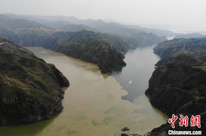 圖為甘肅永靖縣劉家峽遠(yuǎn)眺洮河匯入黃河,入河口呈現(xiàn)出“二龍戲珠”的交匯奇觀。兩條河流匯聚于此,“涇渭分明”,交融卻不滲透,再加上河中石山,猶如兩條巨龍游戲于此,在當(dāng)?shù)剡@景象也被稱為“二龍戲珠”。(資料圖) 楊艷敏 攝