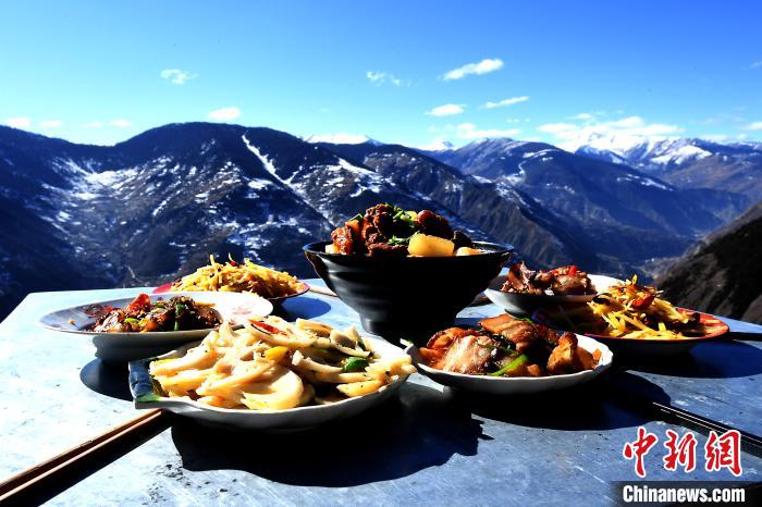 正午時分,紅燒牦牛筋、臘肉香腸、紅苕稀飯等一道道菜肴,從一間農(nóng)家小屋里新鮮出爐,端到海拔3200多米的懸崖旁的方桌上。四川省阿壩州小金縣麻足寨,天藍如洗,幽谷新雪,冬日暖陽下,白云似觸手可及。甘家溝村扶貧第一書記張飛如常打開手機,用短視頻記錄下“云端餐廳”村民用餐的場景。