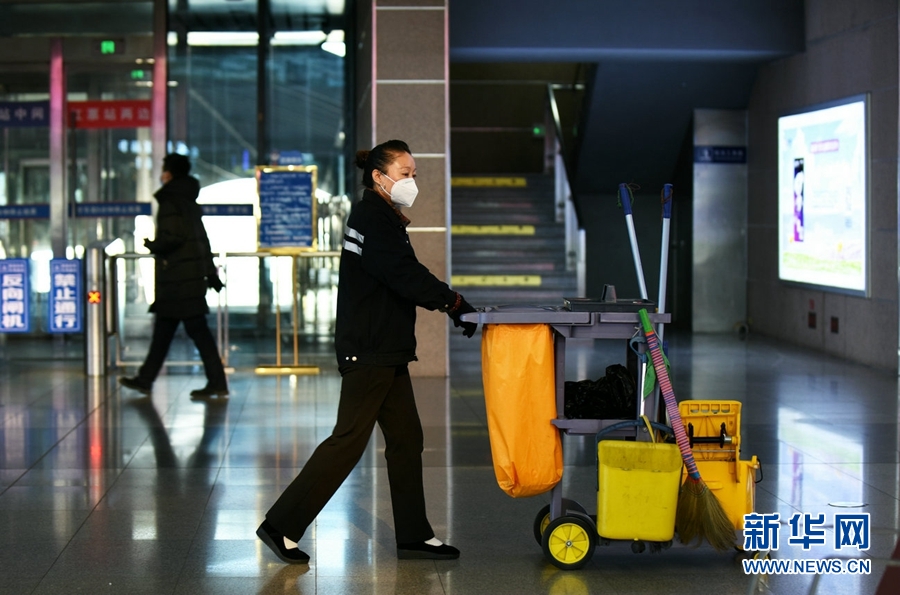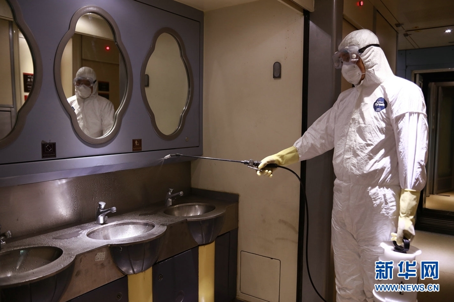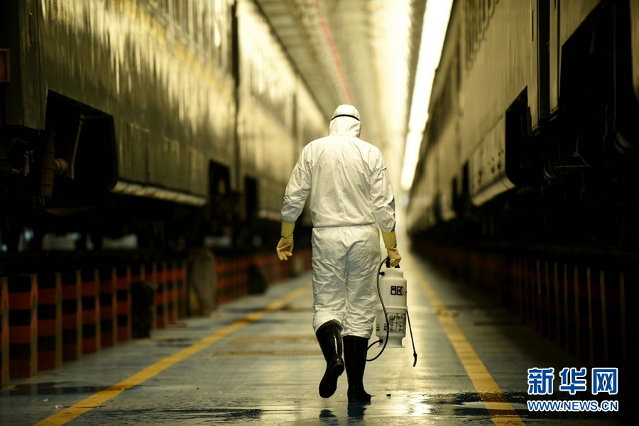 工作人員對(duì)每一列旅客列車(chē)進(jìn)行消毒作業(yè)。新華網(wǎng) 郝寶君 攝