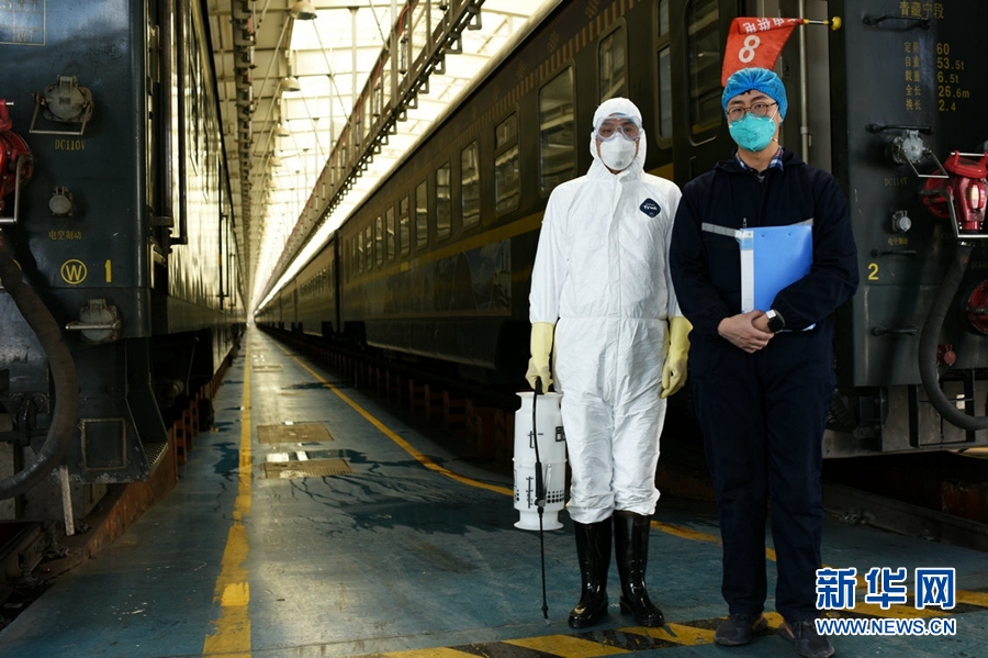 在西寧車(chē)輛段車(chē)庫(kù)內(nèi),鐵路防疫人員對(duì)每一輛旅客列車(chē)進(jìn)行全面消殺作業(yè)。新華網(wǎng) 李俊 攝