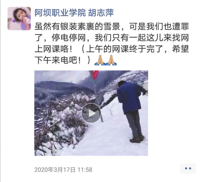 胡志萍是阿壩職業(yè)學(xué)院的大二學(xué)生,家住四川省阿壩藏族羌族自治州小金縣扶邊鄉(xiāng)高卡村。3月17日一早,胡志萍發(fā)現(xiàn),由于前一夜的大雪壓壞了線路,家里斷電斷網(wǎng)了。