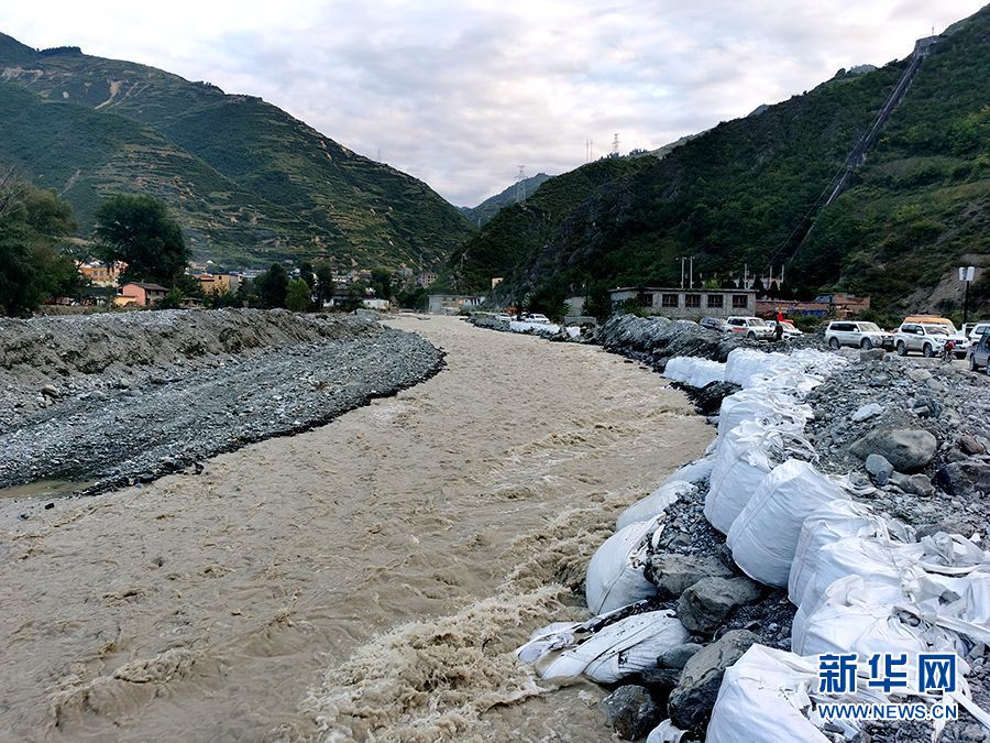 這是舟曲縣曲告納鎮(zhèn)一處用沙袋修筑的河堤。新華網發(fā)(張靜 攝)