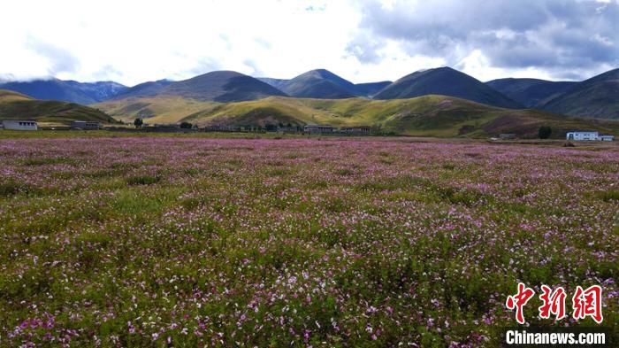 稻城縣噶通鎮(zhèn)八美村位于亞丁機(jī)場前往亞丁景區(qū)的交通要道上。長期以來,這片草原沙化現(xiàn)象日益嚴(yán)重,當(dāng)?shù)卮迕褓囈陨娴膫鹘y(tǒng)放牧都難以為繼。2016年以來,稻城縣利用生態(tài)治理工程實(shí)施的契機(jī),整合全域旅游和脫貧攻堅(jiān)等涉農(nóng)涉旅資金,在沙化草原上大面積種植格?;?,將1599畝沙化草地打造成色拉花海。
