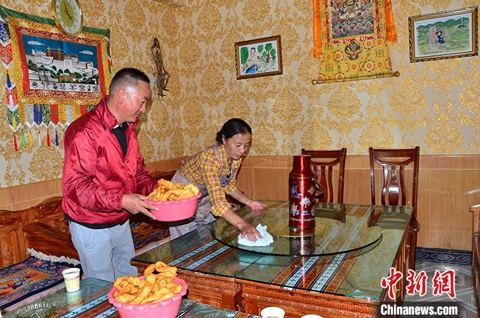 圖為8月20日扎西夫婦倆為客人準備晚餐。 中新社記者 魯?shù)り?攝