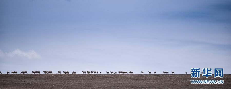 青??煽晌骼锏貐^(qū),一群雌性待產(chǎn)藏羚羊通過(guò)青藏公路后向卓乃湖行進(jìn)(2016年6月7日攝)。新華社記者 吳剛 攝