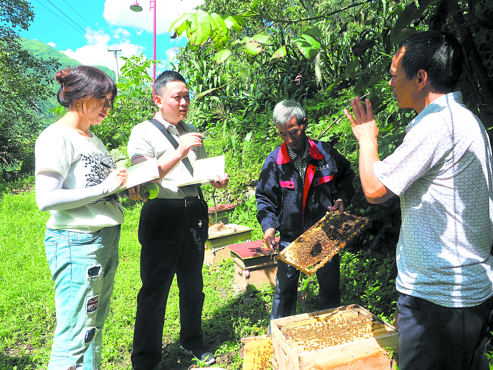回轉(zhuǎn)身去,蒲江縣對(duì)口援助瀘定工作隊(duì)隊(duì)長(zhǎng)吳孟賢正和張洪彬攀談著今年的蜜蜂增收情況?!捌呀h新增財(cái)政幫扶資金277萬(wàn)元作為獎(jiǎng)補(bǔ)資金,激勵(lì)成都三千米甜蜂業(yè)有限公司落戶(hù)瀘定發(fā)展的‘貢嘎中蜂’養(yǎng)殖支援項(xiàng)目,現(xiàn)在已經(jīng)累計(jì)發(fā)放貢嘎中蜂7500余群,幫助全縣38個(gè)貧困村發(fā)展村級(jí)集體經(jīng)濟(jì),示范帶動(dòng)800戶(hù)以上貧困戶(hù)增收?!眳敲腺t滔滔不絕如數(shù)家珍,身旁飛過(guò)的貢嘎中蜂也似乎成了他和其他對(duì)口支援隊(duì)員的化身,他們從舒適的成都平原來(lái)到高原瀘定,懷揣堅(jiān)定的信念,用行動(dòng)肩負(fù)起責(zé)任與擔(dān)當(dāng),他們將藏族同胞的利益裝在心里、舉過(guò)頭頂,排除千難萬(wàn)險(xiǎn),因地制宜推動(dòng)當(dāng)?shù)匕l(fā)展;跋山涉水,進(jìn)居入戶(hù),訪貧問(wèn)苦,為藏族同胞送上溫暖與關(guān)懷……他們用心血和汗水書(shū)寫(xiě)著一個(gè)大大的“愛(ài)”字,甜到藏族同胞的心坎上。
