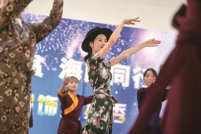 青海省海南州精準(zhǔn)扶貧綠色產(chǎn)業(yè)發(fā)展園園區(qū)內(nèi)模特們?cè)谡故久褡宸棥?邵丹 攝