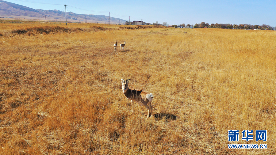 青海湖國家級(jí)自然保護(hù)區(qū)管理局南岸保護(hù)站,一群普氏原羚正在悠閑漫步。新華網(wǎng) 汪要強(qiáng) 攝
