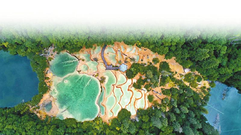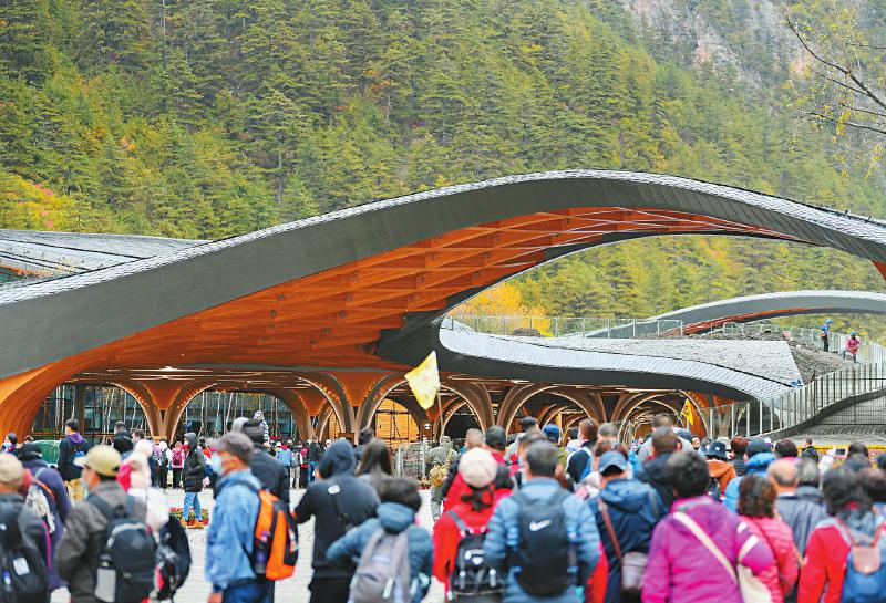 以景推城。在九寨溝,處處可見“生態(tài)優(yōu)先”的痕跡——生態(tài)擋墻間的動(dòng)物通道,游客腳下的生態(tài)棧道、景區(qū)外的旅游環(huán)保法庭……