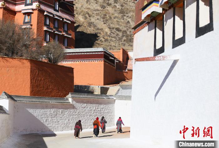 11月上旬,冬日的拉卜楞寺,陽(yáng)光灑落在黃色、紅色、白色的院墻上,忙碌的工匠裹著頭巾,用傳統(tǒng)潑灑方法為寺院院墻“美顏”;路過(guò)的僧人踏著匆忙的腳步前往佛殿,繼續(xù)一日的課程;來(lái)往的游客穿梭在寺院各個(gè)巷道間,虔誠(chéng)感受這所“世界藏學(xué)府”的獨(dú)特魅力。