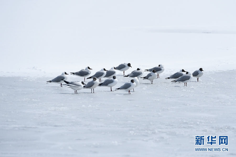 一群水鳥(niǎo)棲息在青海湖的冰面上。(資料圖)新華社記者 張龍 攝