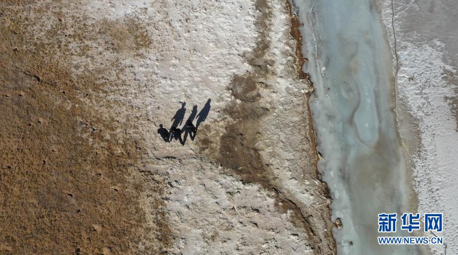 12月7日,站長趙新錄(中)與隊(duì)友鄧海平(左)、達(dá)才在可可西里索南達(dá)杰保護(hù)站管護(hù)區(qū)域內(nèi)巡查(無人機(jī)照片)。新華社記者 王艷 攝
