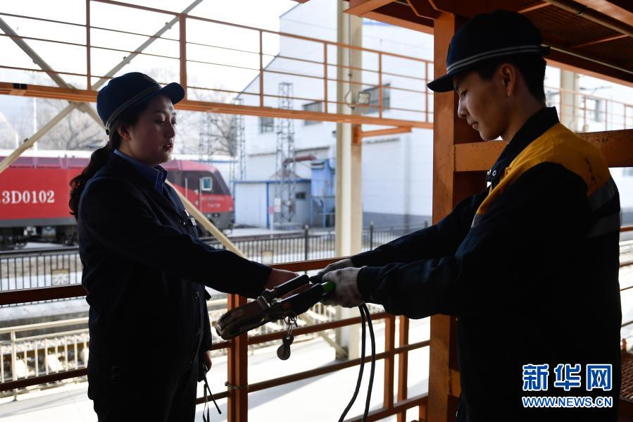 2月24日,在青藏鐵路公司西寧機(jī)務(wù)段整備車間,隔離開關(guān)班組成員賀霞(左)在工作中。新華社記者 張龍 攝