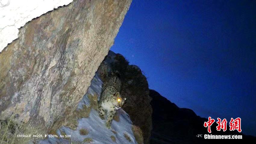 圖為相機夜幕下抓拍到的雪豹活動畫面。青海原上草自然保護中心供圖