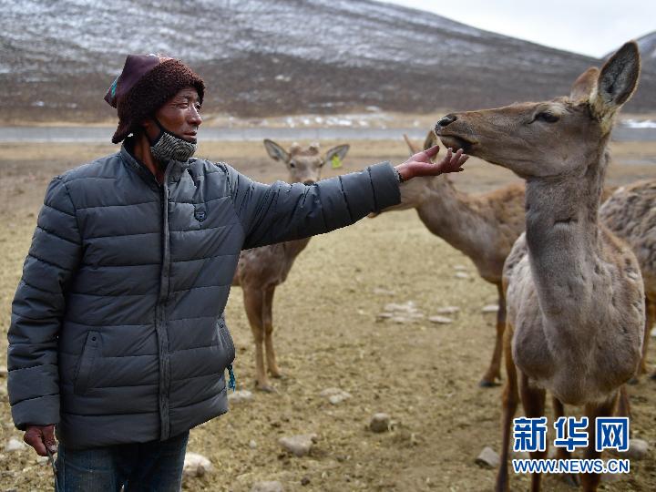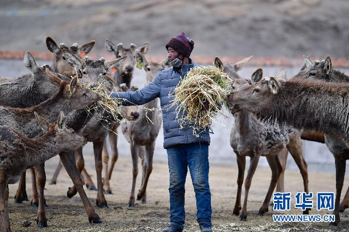 3月13日,甘德縣崗龍鄉(xiāng)恰不將村生態(tài)畜牧業(yè)專業(yè)合作社村民在鹿場(chǎng)喂鹿。新華社記者 張龍 攝