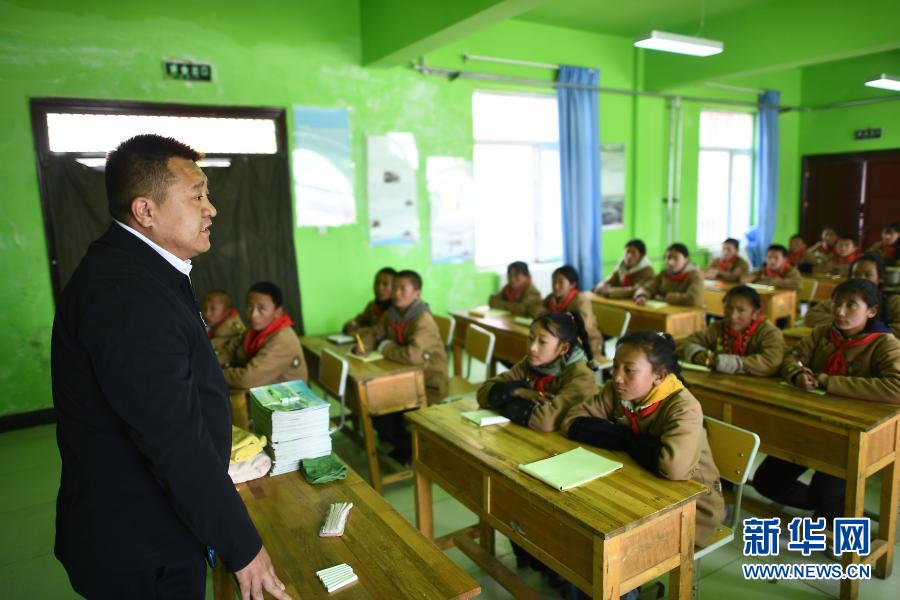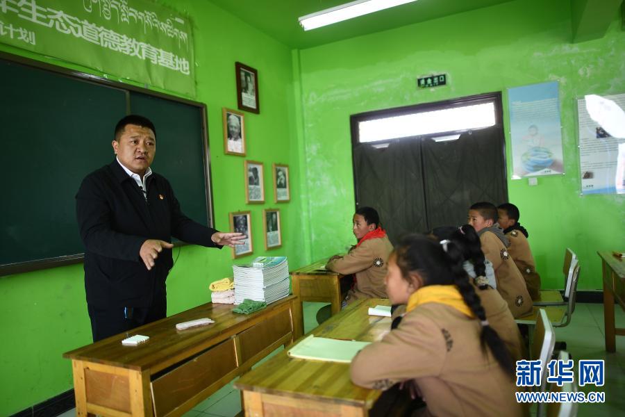 3月23日,索南旦正(左)在吉尕小學青少年生態(tài)道德教育基地授課。新華社記者 張宏祥 攝