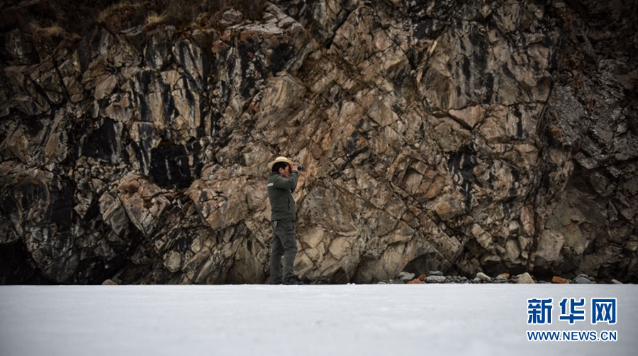 4月23日,祁連山國(guó)家公園沙龍灘管護(hù)站生態(tài)管護(hù)員羅藏次成在巡護(hù)途中使用望遠(yuǎn)鏡監(jiān)測(cè)野生動(dòng)物。新華社記者 吳剛 攝