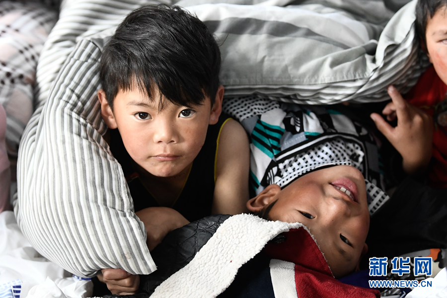 5月22日,在瑪多縣黃河鄉(xiāng)寄宿制學(xué)校救災(zāi)安置點(diǎn),孩子們?cè)谛菹ⅰP氯A社記者 張龍 攝