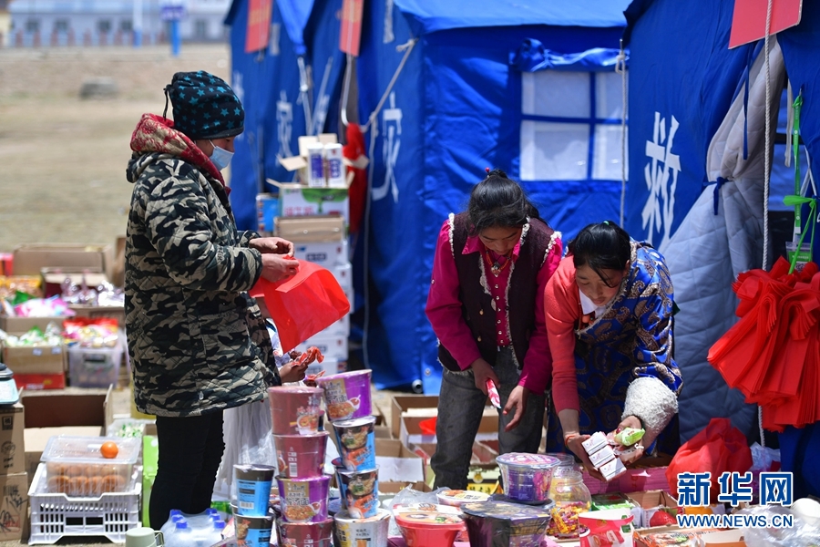 為穩(wěn)定市場(chǎng)秩序,方便居民生活,瑪多縣市場(chǎng)監(jiān)督管理局從5月23日開(kāi)始,搭建臨時(shí)帳篷市場(chǎng),服務(wù)群眾。5月26日,兩名受災(zāi)群眾在瑪查理鎮(zhèn)安置點(diǎn)的帳篷超市選購(gòu)商品。