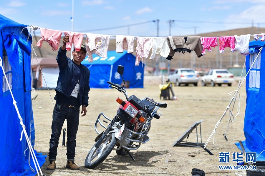 5月26日,瑪查理鎮(zhèn)安置點(diǎn)內(nèi),一名受災(zāi)群眾正在晾曬衣物。