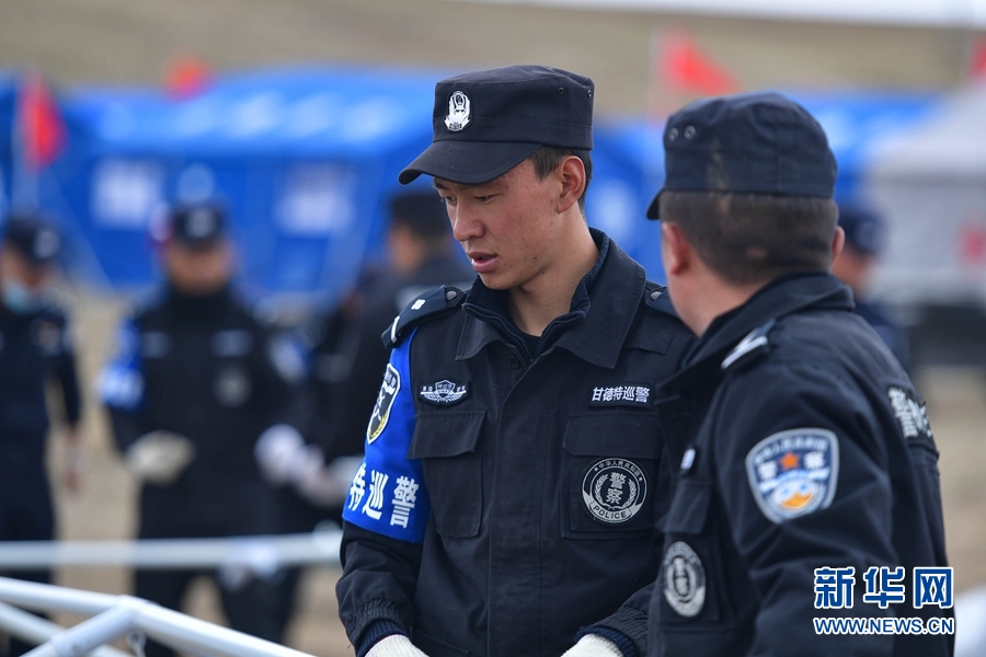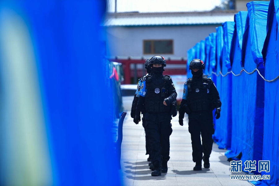 5月26日,果洛州公安局特警支隊(duì)的特警在瑪多縣縣政府廣場(chǎng)臨時(shí)安置點(diǎn)內(nèi)巡邏。