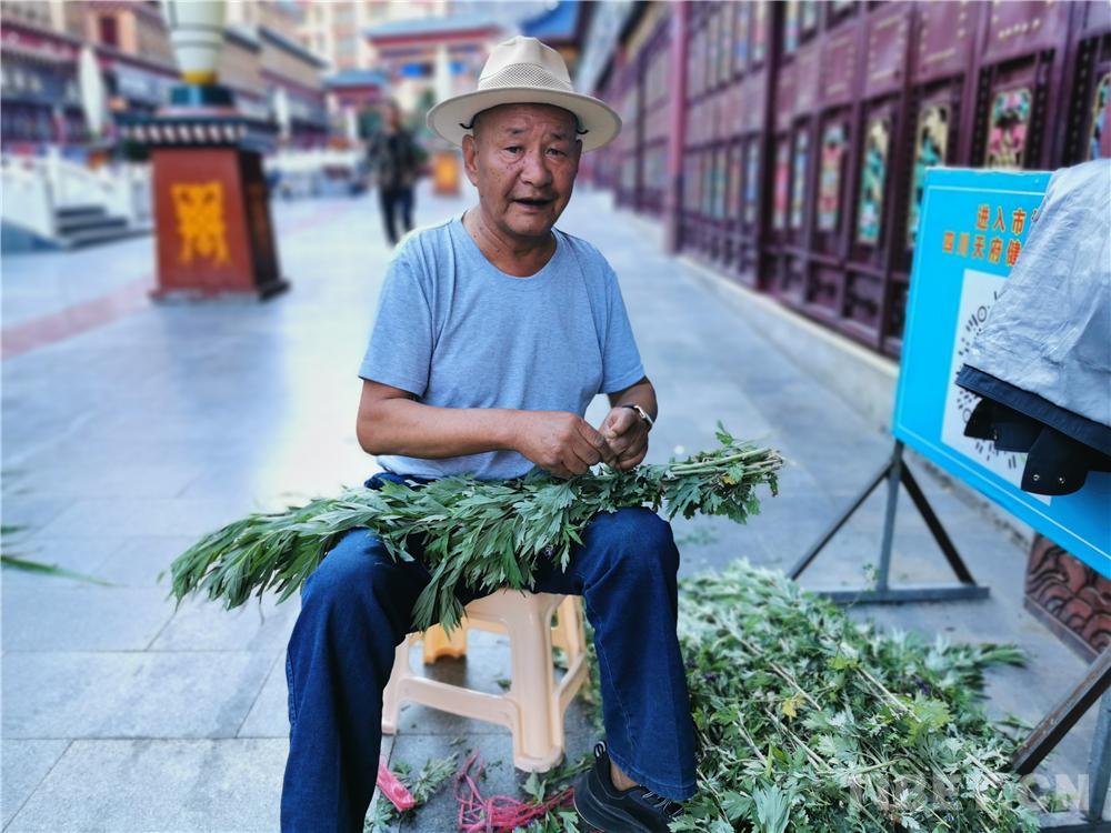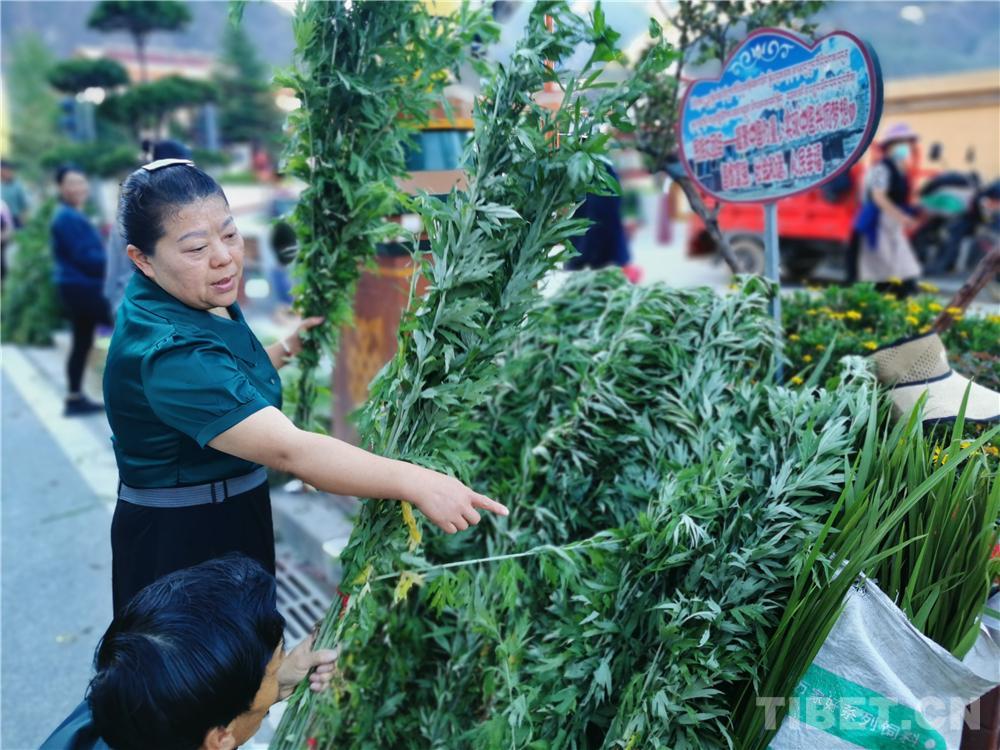圖為藏族婦女懷抱剛買的菖蒲、艾葉