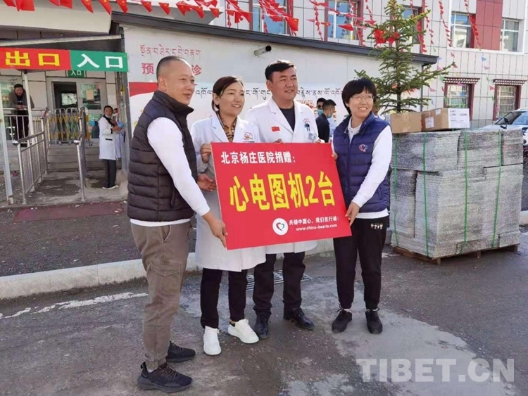 圖為馮亞靜和韓菲代表石景山楊莊醫(yī)院向久治縣醫(yī)院贈(zèng)送兩臺心電圖機(jī)