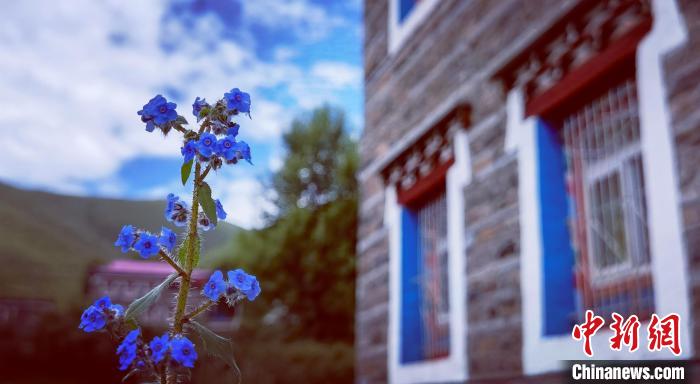 藏式民居旁盛開的小藍花。劉忠俊 攝