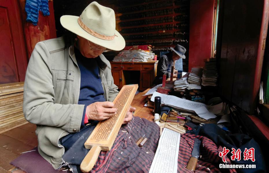 7月20日,四川德格,印經(jīng)院藏族雕版印刷非遺傳承人校對(duì)木刻版。中新社記者 劉忠俊 攝