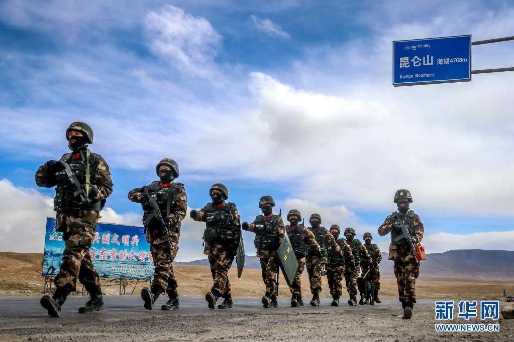 武警青??傟?duì)執(zhí)勤支隊(duì)執(zhí)勤七中隊(duì)官兵在昆侖山口巡邏(2月3日攝)。新華社 楊浩 攝