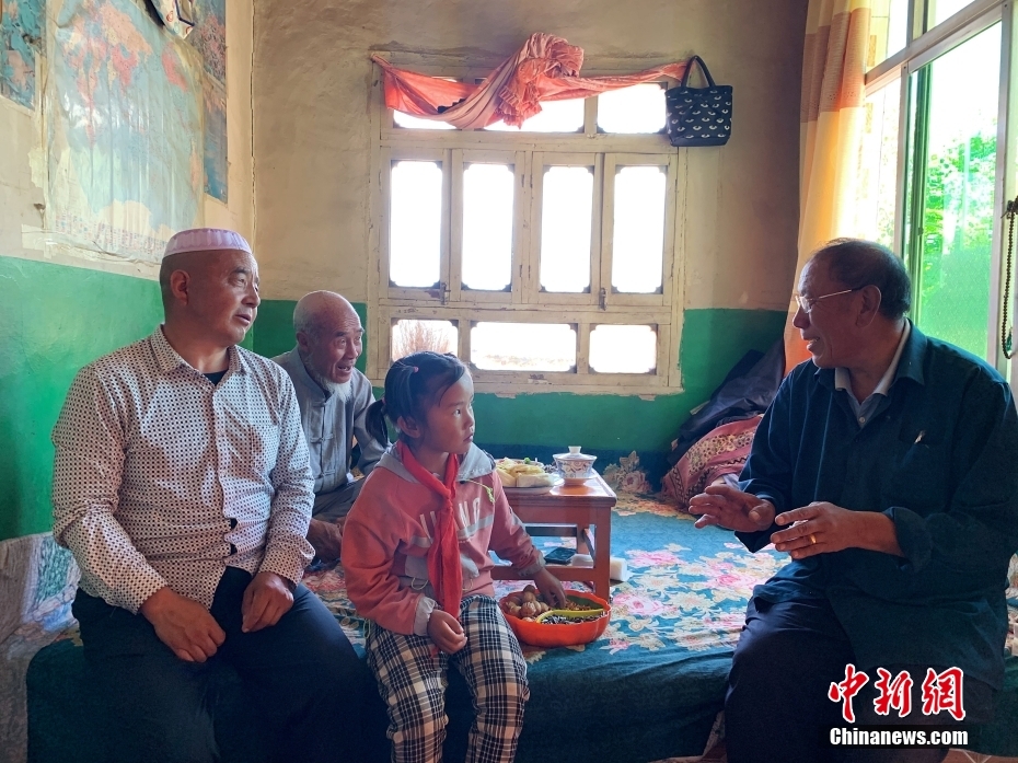 青海省海東市循化撒拉族自治縣白莊鎮(zhèn)來塘村一戶學生家,藏族教師完么仁增(右一)與學生家長交流。中新社記者 馬銘言 攝