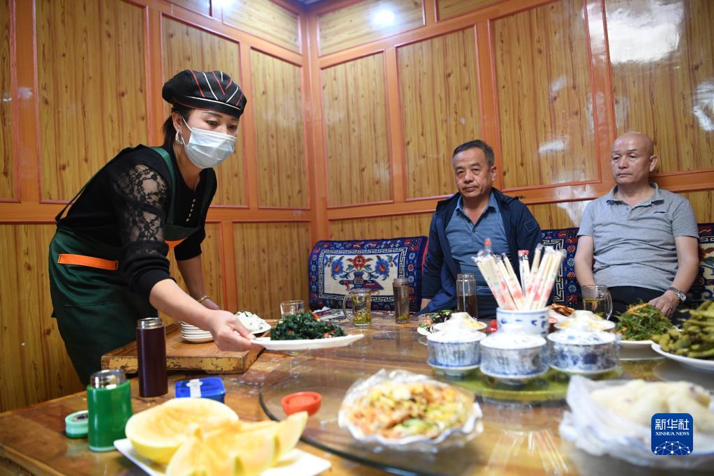 甘肅甘南卓尼縣木耳鎮(zhèn)力賽村村民李日占草(左)在自家的農(nóng)家樂(lè)里為客人上菜(9月11日攝)。新華社記者 陳斌 攝