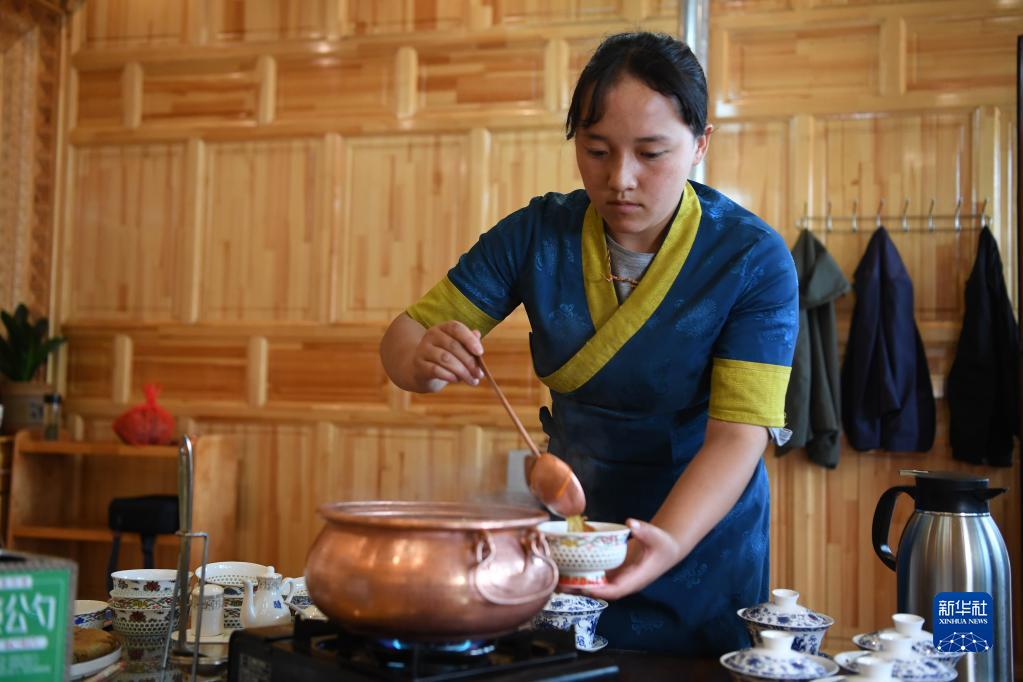 甘肅甘南卓尼縣木耳鎮(zhèn)力賽村村民拉姆卓瑪在自家的農(nóng)家樂(lè)里為客人盛湯(9月11日攝)。新華社記者 陳斌 攝